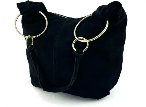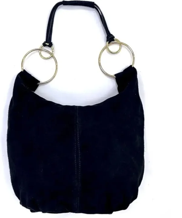 GROTE SUEDE TAS MET GROTE GOUDEN RING. Kleur: zwart Materiaal: Kalfsleer handmade in Italy Maat: 46x70x7cm