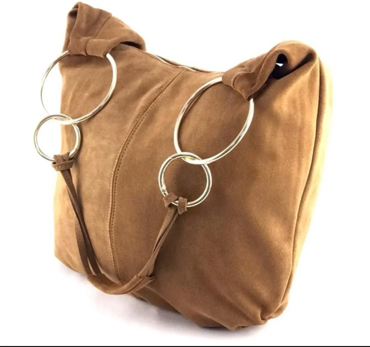 GROTE SUEDE TAS MET GROTE GOUDEN RING. Kleur: cognac Materiaal: Kalfsleer handmade in Italy Maat: 46x70x7cm
