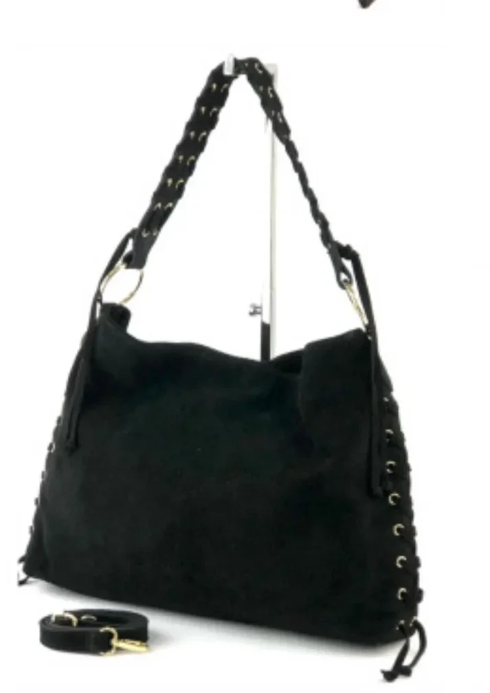 GROTE SUEDE TAS, MET GROTE GOUDEN RINGEN. Kleur zwart. Materiaal: kalfsleer. Handmade in Italy. Maat 40x30x7,5cm